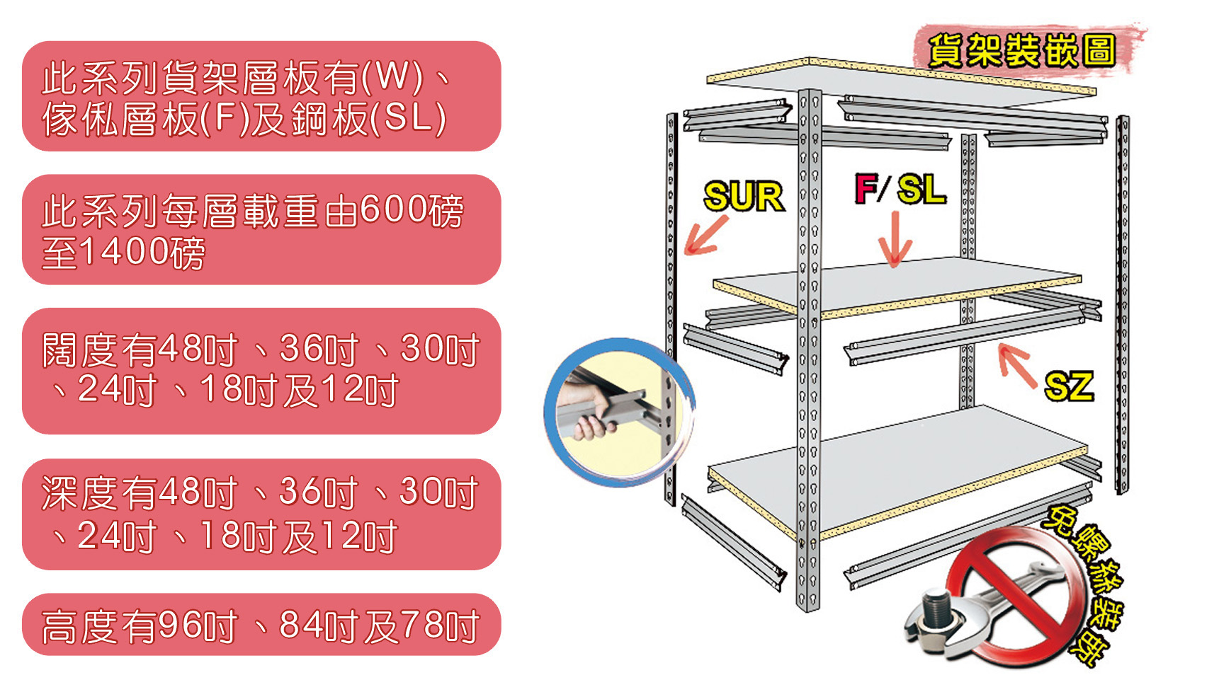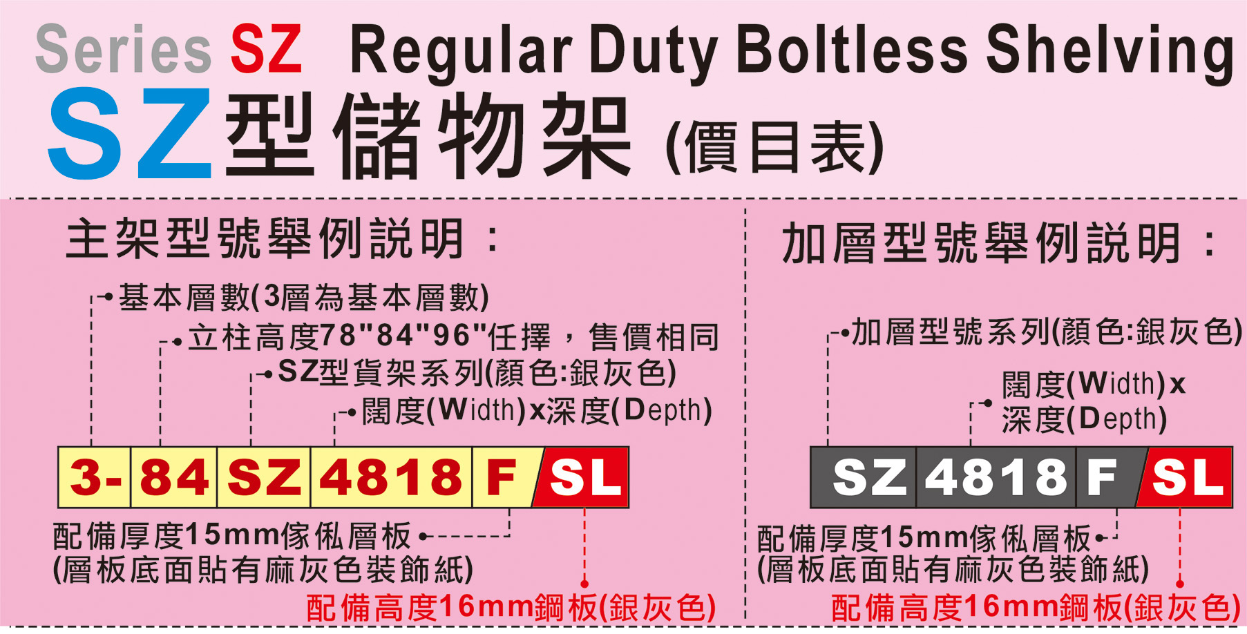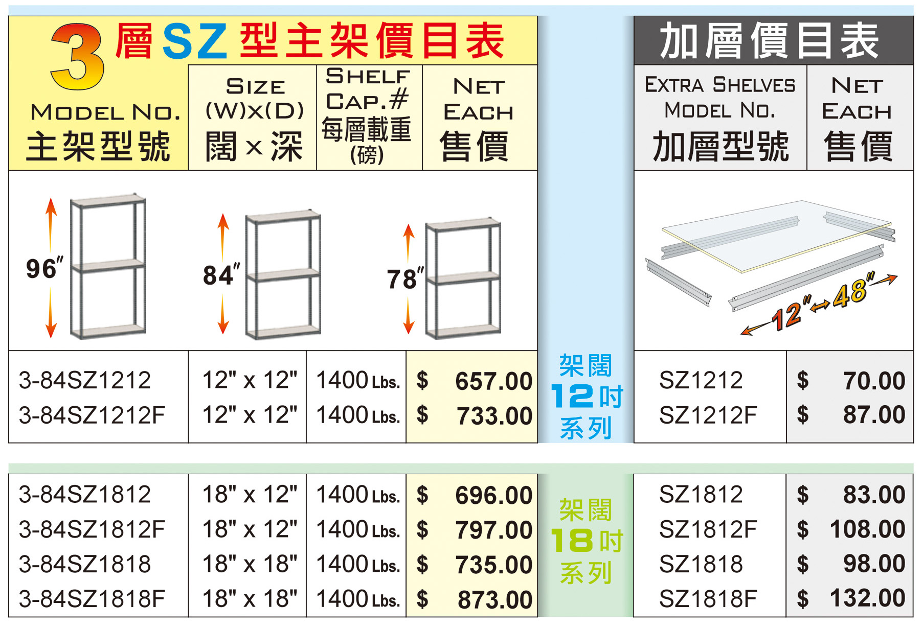 SZ型儲物架系列提供多種規格選擇,闊度有12吋、18吋、24吋、30吋、36吋及48吋,深度有12吋、18吋、24吋、30吋、36吋及48吋,高度有78吋、84吋及96吋,可根據您的空間大小及物品尺寸進行靈活配置。每層高低可任意調節,上下調節單位僅為1-1/2吋,充分利用垂直空間,實現最大儲物效率。無論是窄小角落還是寬敞倉庫,都能找到最合適的尺寸搭配。