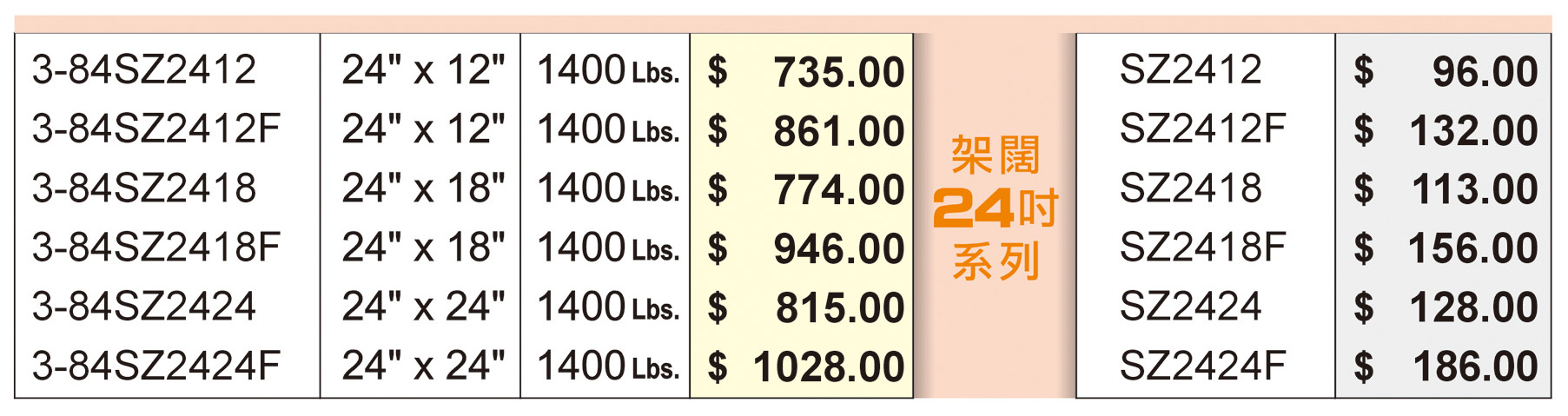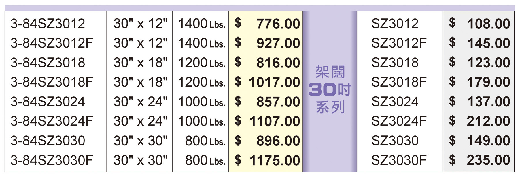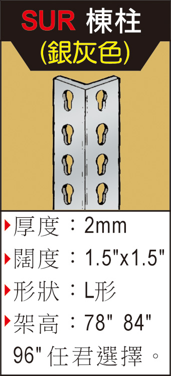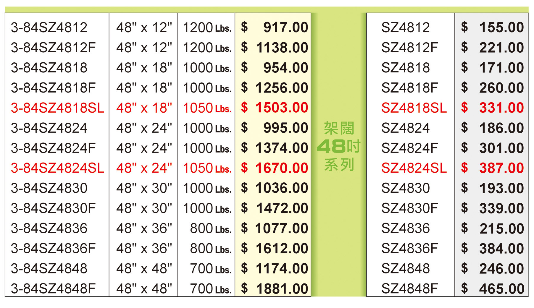 SZ型儲物架系列提供多種規格選擇,闊度有12吋、18吋、24吋、30吋、36吋及48吋,深度有12吋、18吋、24吋、30吋、36吋及48吋,高度有78吋、84吋及96吋,可根據您的空間大小及物品尺寸進行靈活配置。每層高低可任意調節,上下調節單位僅為1-1/2吋,充分利用垂直空間,實現最大儲物效率。無論是窄小角落還是寬敞倉庫,都能找到最合適的尺寸搭配。